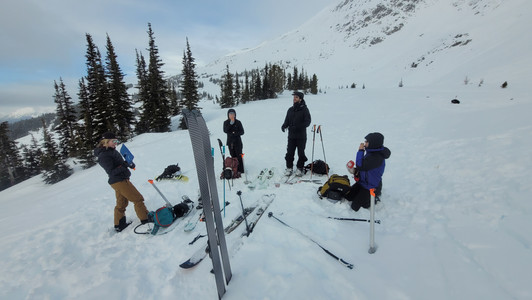 Dec 31, 2023. Our first day backcountry skiing! Which also happened to be Jas' first day skiing ever. We did Zoa, a Coquihalla Classic, with my dad, uncle, and brother on snowshoes. It's a great place to go: safe and mellow terrain, with low avalanche risk and a cleared pipeline (basically a green run at a resort) all the way back to the car to get some good practice turns in. So, although it was a bit bold to ski for the first time in the backcountry, we set off up the skintrack!