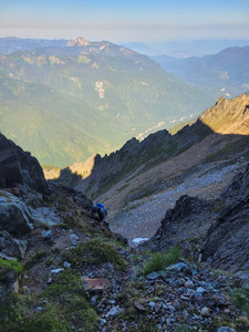 The way down always requires care, so we once again disregarded the time and started scrambling down. We arrived at the ropes, and I set up the rappel, tying the 30m climbing rope to the 30m RAD line for a tag line to pull the rope. This makes for a slightly mismatched rappel as the ropes are different diameters, but for only 2 rappels it doesn't make a difference. Soon, we were below the rope section, and worked our way down the scree gully to get back to the ramp system.