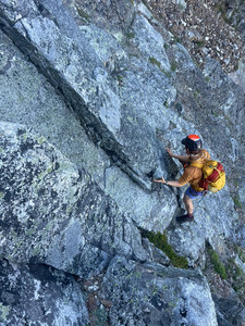 At last we were at the base of the roped-up climbing, a closer-to-vertical section barring access to the summit. This can either be done two short pitches, or linked in a "simul-climbing" pitch where I lead and when the rope tied to Ihor gets tight, he starts up after me. We are both protected by the gear that I placed in the rock in case we fell, but the idea is not to fall and drag the other person down too. Once at the top, I secured the rope to a belay station and Ihor soon was at the top of the pitch standing next to me.