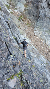 After catching up to Brennan, we had about 200m left to scramble to the summit of Crossover. In front of us, was a rather vertical looking section to overcome. After some humming and hawing (mostly on my part) about if the rope needed to come out, we chose a tricky but somewhat protected option. The move was low-5th to mid-5th class but didn't last long, and above was much easier terrain all the way to the top of Crossover.