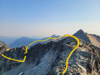 It was 5:40 pm by the time we left the summit of S. Rexford, and daylight was not on our side as dusk was at 8 pm. If our next summit, Batholith Peak, proved to be challenging, we would have to bivvy on the summit. We returned to our packs, and pressed on down the ridge, unsure of what lay ahead. In the photo below, I have overlaid a Red Line for Day 1, and a Yellow Line for Day 2, viewed from S. Rexford Peak.