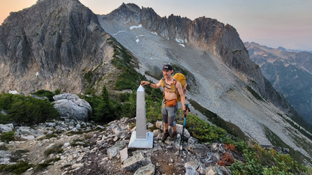 Up next was Cope Peak proper, which lay not too far away. According to the Peakbagger website, up next lay Ensawkwatch Peak, SW Middle Peak, Rapid Peak, and Pocket Peak. Even Drew Breyshaw did not have beta for me on the middle part of this section, as he'd been turned around by an aggressive bear when he'd tried. The sun began to climb in the sky as we reached Cope Peak, just before the USA border. The heat ramped up, and it was time for tarps off once again. We stood on the summit at ~6:30 am, quick moving from Cope N.!