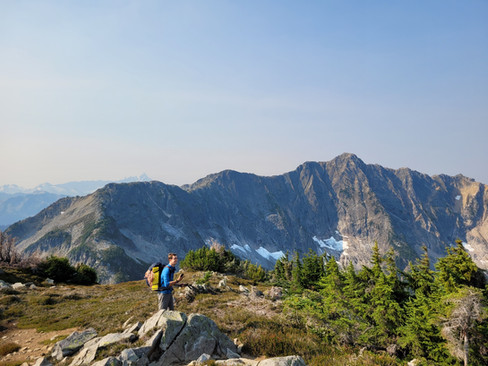 The summit of Rapid was the true turn-around point for the trip, smack dab in the bottom of the oblong "U" shaped ridge. The Americans seem to have derived "Silesia" while Canadians landed on Slesse. Perhaps this is related to local oral indigenous tradition and was spelled differently but pronounced similarly. Anyways, it was just after 12 pm, 7 hours into Day 2, and we were feeling it. With no time to spare, I snapped a quick summit photo: Pocket Peak on the left, Slesse, and Rexford far Right, a little hazy in the smoke.